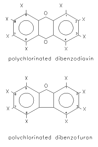 A polychlorinated dibenzodioxin is two benzene rings joined together by two oxygen atoms. A polychlorinated dibenzo-furan is similar but has only one oxygen atom. These compounds are expressed by the following diagrams.