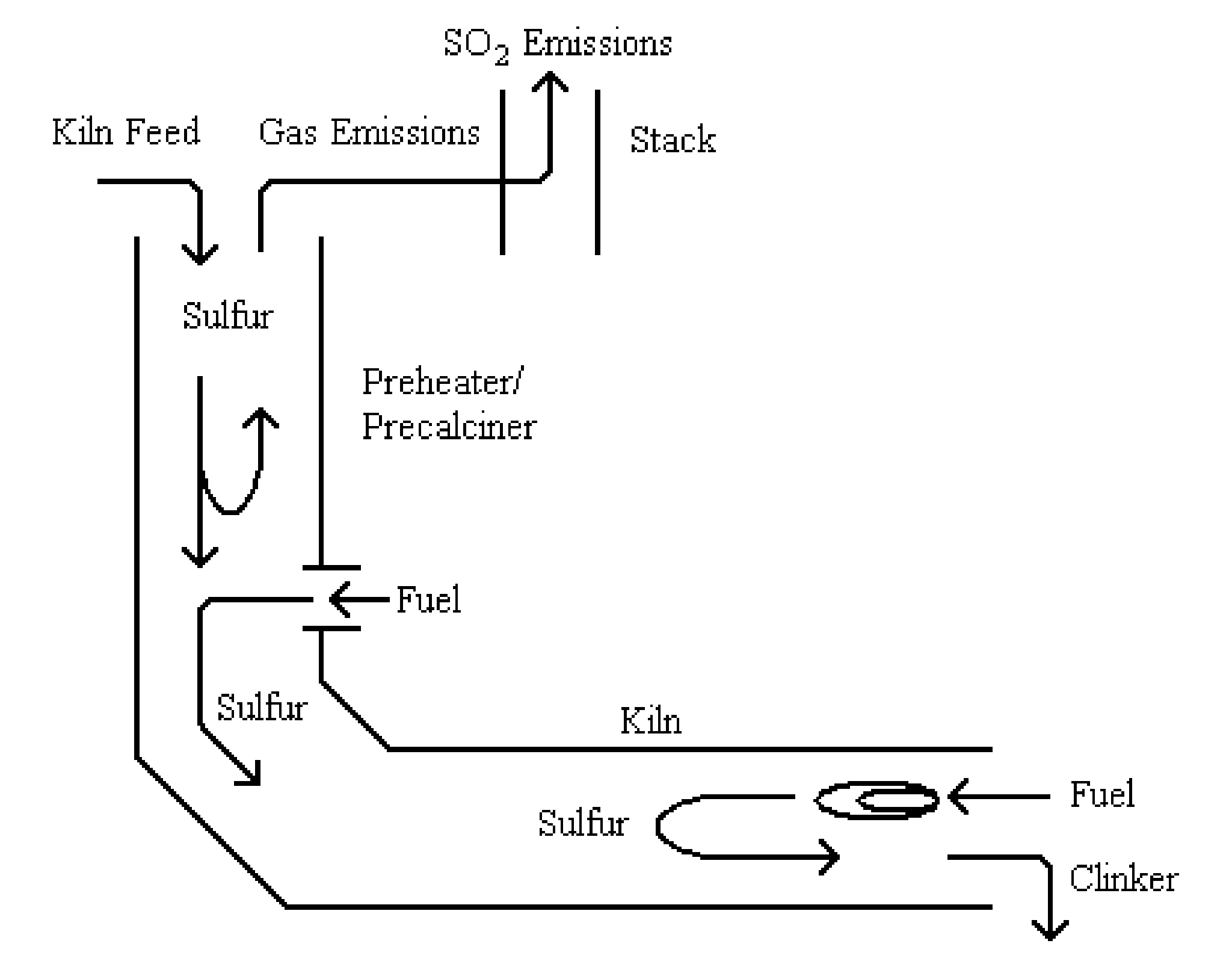 Figure 1 provides a simplified schematic of the sulfur flow in and out of a preheater/precalciner cement kiln. In a properly operated cement kiln system with a reasonable alkali balance, sulfur from fuel exits in the clinker. Sulfur in raw materials is split, some exiting with clinker and the rest in stack emissions.