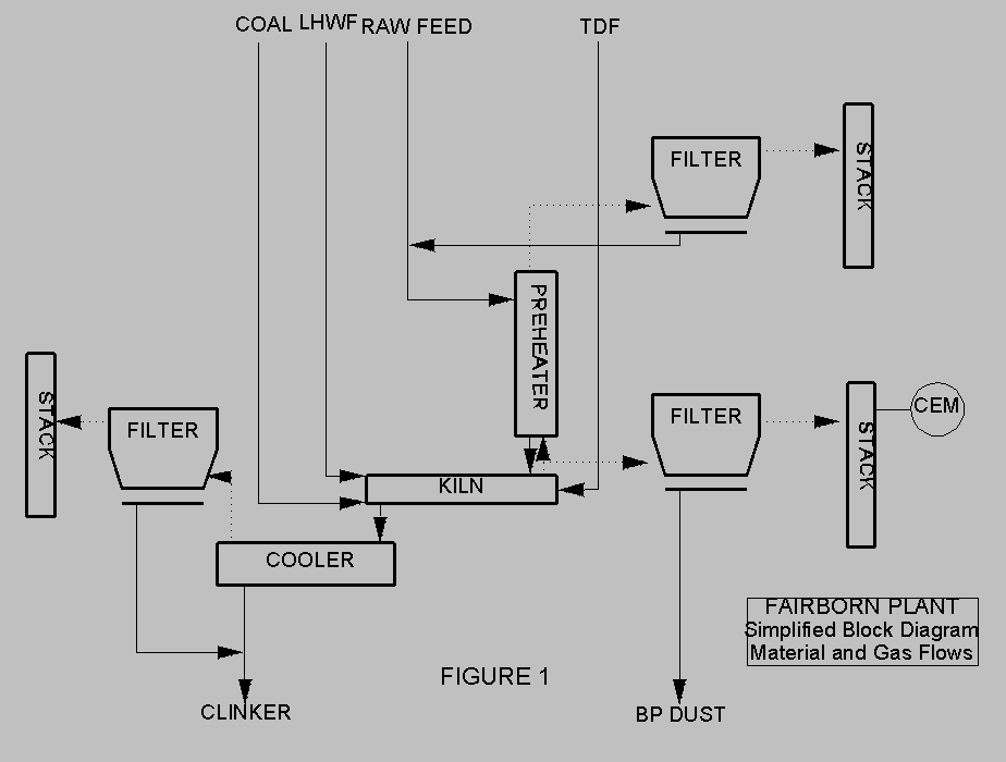 Southdown's cement kiln in Fairborn, OH is depicted schematically in Fig. 1. It is a four-stage dry-process suspension preheater kiln, without precalciner, with a production rate of 85 short tons of clinker per hour. As usual for this type of kiln system, the raw meal is fed to the uppermost of the four cyclone stages of the preheater, while the hot combustion gases from the kiln enter the preheater from the gas duct to the lowest stage. Thus, the raw meal is preheated to approximately 1550F when it enters the rotary kiln while the combustion gases entering the lower part of the preheater at 1900F-2000F are cooled to 700F at the preheater outlet. The preheater off-gases are further cooled in the raw material drying and grinding system, prior to entering the baghouse air pollution control device. From the baghouse, the gases are discharged into the stack. The plant typically uses 7.5 tons/hour of pulverized coal as primary fuel, supplemented with about 2.8 tons/hour of liquid hazardous waste fuel, which is atomized with compressed air concentrically at the tip of the pulverized coal burner. Also, 0.5 ton/hour of tire derived fuel is added to the kiln system in the transition housing between the rotary kiln and preheater.