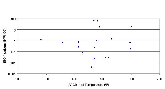 Figure 1. Cement Kiln Dioxin Emission TEQs vs. APCD Inlet Temperature